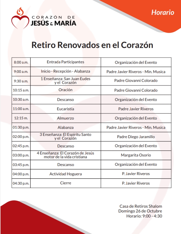 “Renovados en el Corazón” es una experiencia espiritual viva, fresca y profundamente actual, pensada para jóvenes, adultos y familias completas. Inspirado en la espiritualidad Eudista y en la gracia de la Renovación Carismática Católica, este retiro ofrece un encuentro personal y transformador con Jesucristo, desde el corazón: el lugar donde Él desea sanar, renovar y encender nuestra vida con su Espíritu Santo.